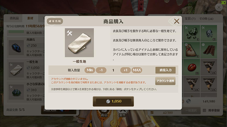 みんながお探しの一般生地は、雑貨商人から購入することができます。衣装や帽子を製作するのに必要で、300ぐらいあればひとまず足りると思います。
