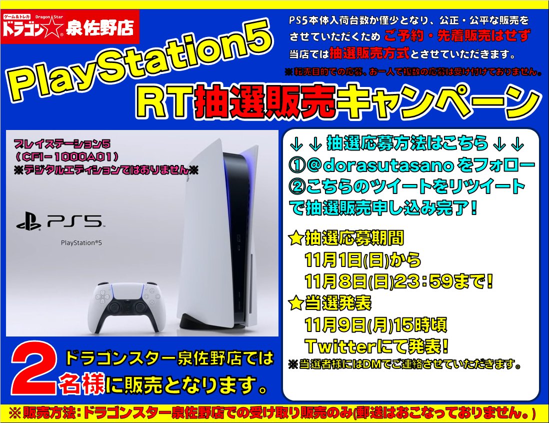 大阪のドラゴンスター泉佐野店と岸和田春木店で、プレ5の販売予約を抽選受付しています。台数は泉佐野店2台・岸和田春木店1台、条件なし、受取は店舗、応募はツイッターのフォロー&RTです。