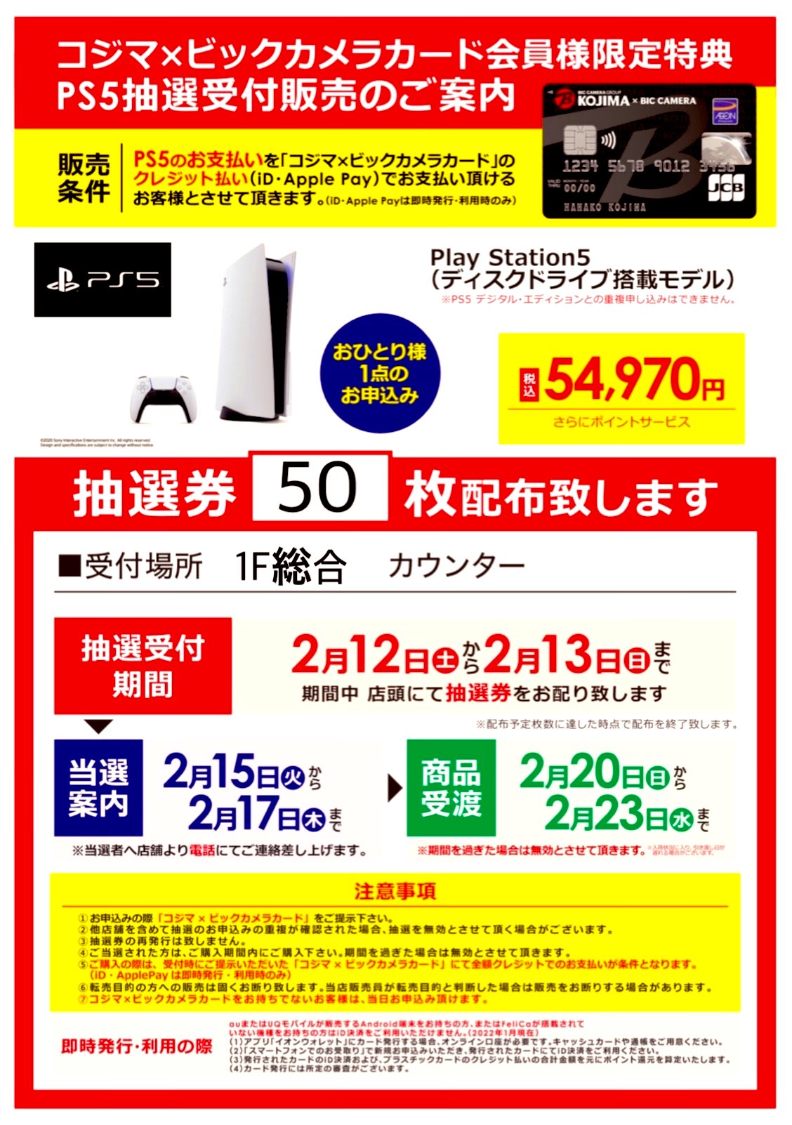 コジマはPS5の発売以来ずっと条件なしの抽選券配布でしたが、今回はコジマxビックカメラカードでのクレジット払い(iD・Apple Pay)が応募・購入条件になりました。