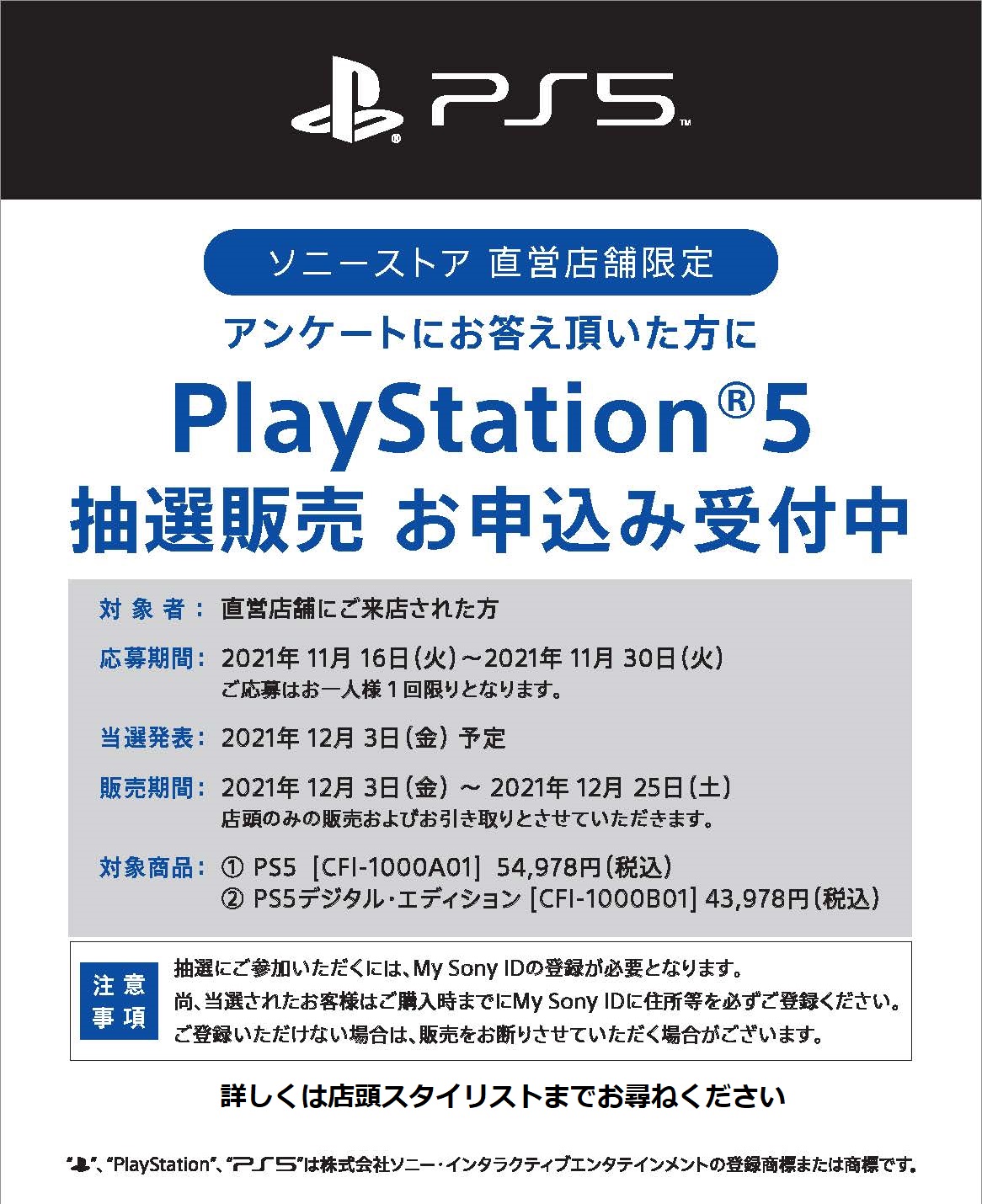 12月3日(金)以降にMy sony ID登録のEメールアドレスへ順次送信。当落どちらも通知。