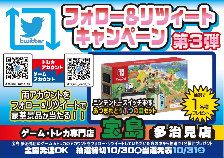 応募は、宝島多治見店のゲームアカウントとトレカアカウントの2つをフォローし、2つの対象ツイートをRTしてください。